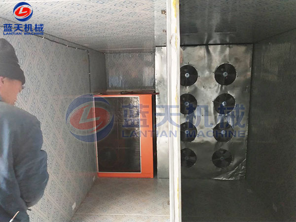 江苏淮山烘干设备烘干现场,江苏王总购买的是箱式淮山烘干设备,切片装入托盘物料车进行烘干。