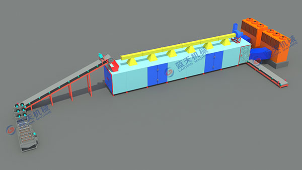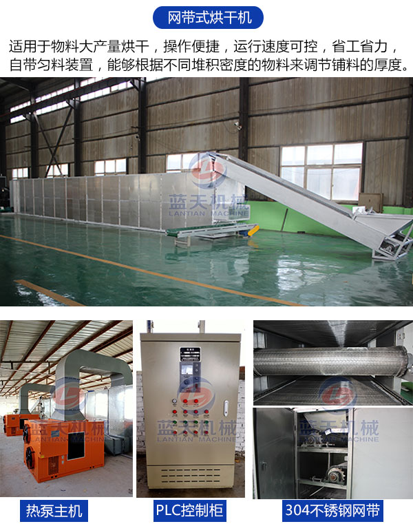 3、烘干机箱体:用来烘干的主要装置,内置多层网带结构,根据不同的烘干产量烘干箱体长度各不同,还可以根据客户的需要进行定制;