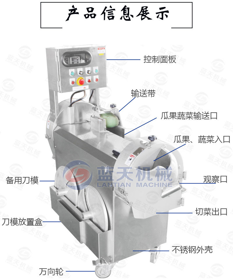 设有安全按钮,门打开使整台设备无法转动,速度快,产量大,通过双变频调节速度,大型山药全自动切片机可切出1-60MM规格的段,操作简单,易清洗。